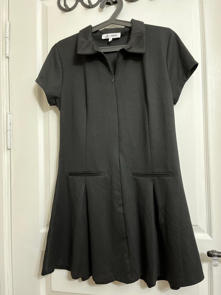 Kısa kollu, yakalı ve pileli detaylara sahip siyah midi elbise, sentetik kumaştan üretilmiş, ofis için uygundur.