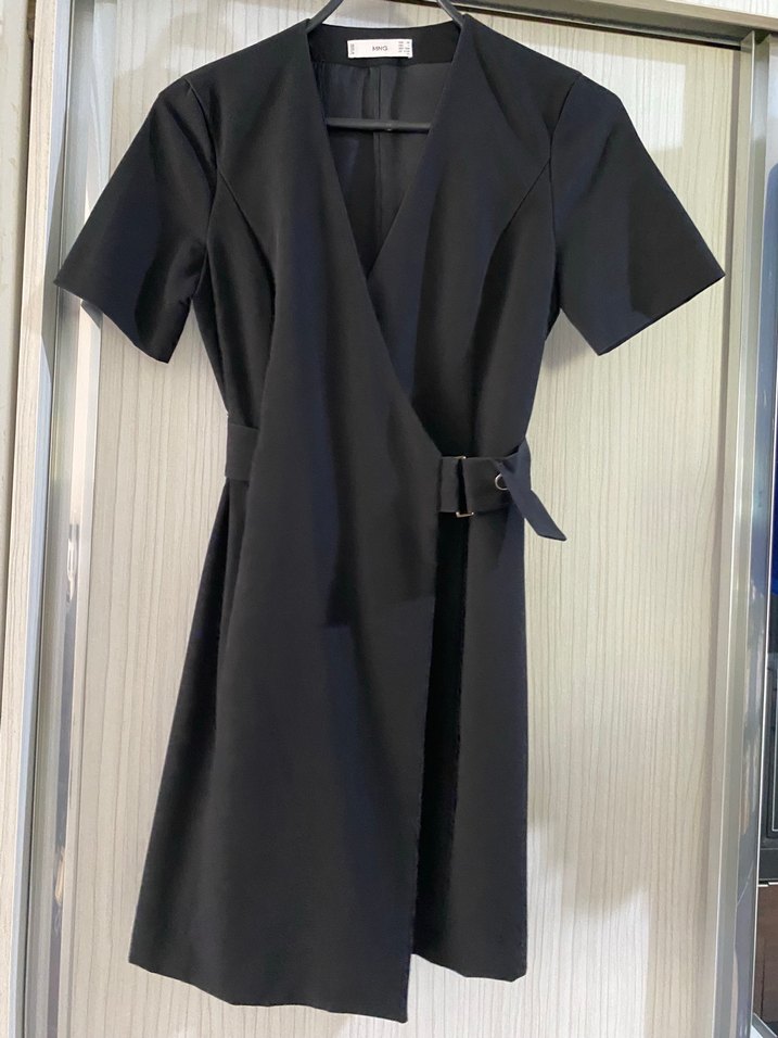 Siyah midi elbise, kısa kollu ve regular fit. Yanında kemer detayı ve derin V yaka bulunur. Desensiz, gotik stile uygun.