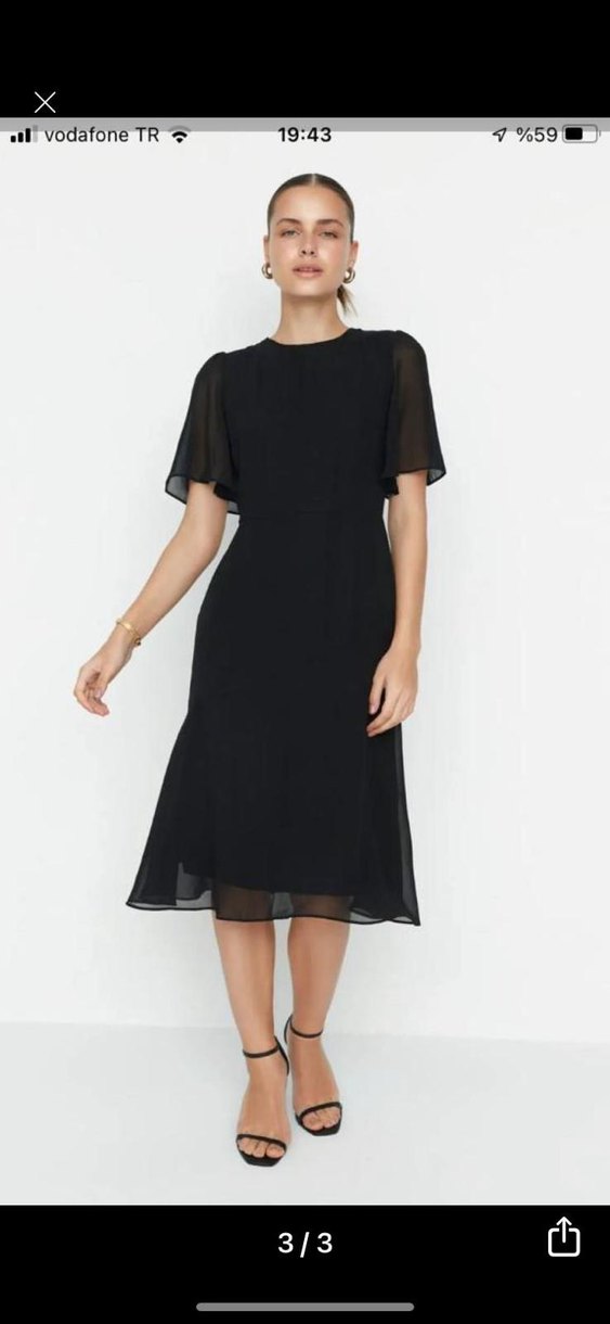 Bu siyah midi elbise kısa kollu, yuvarlak yakalı ve drapeli tasarıma sahip olup, minimalist ve klasik gotik tarzıyla ofis kullanımı için uygundur.