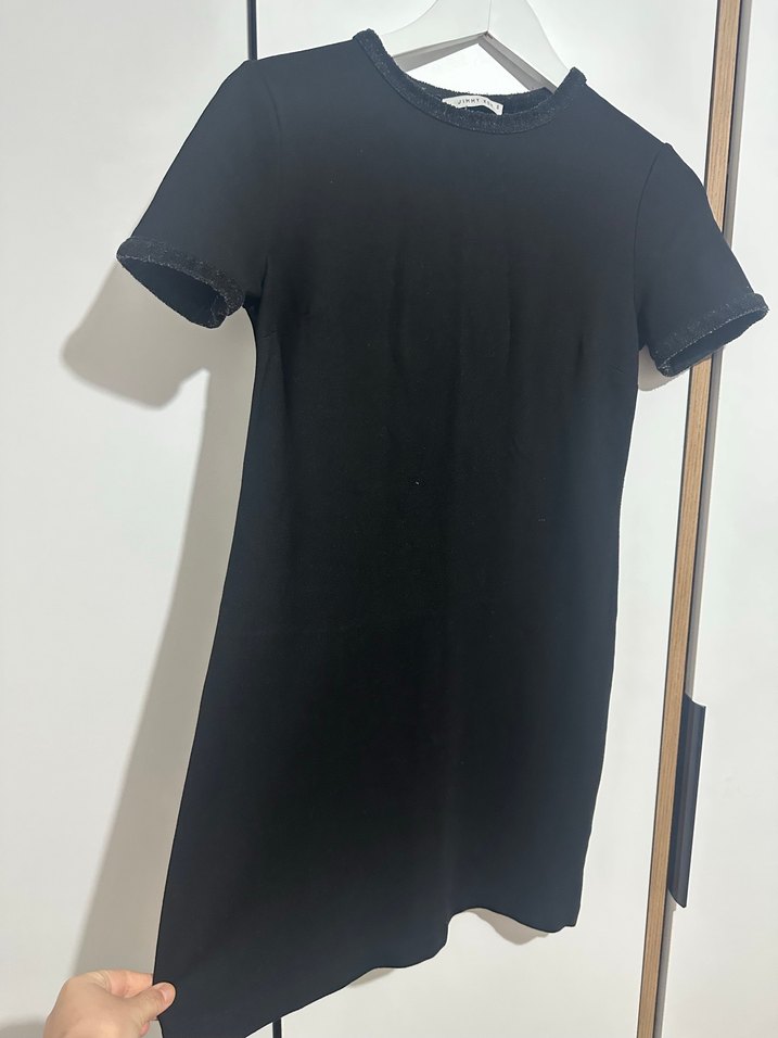 Kısa kollu, bisiklet yaka ve fermuarlı tasarıma sahip siyah kadın kazak. Yumuşak sentetik kumaştan, baskılı desenli ve mini uzunlukta. Marka: Jimmy Keys.
