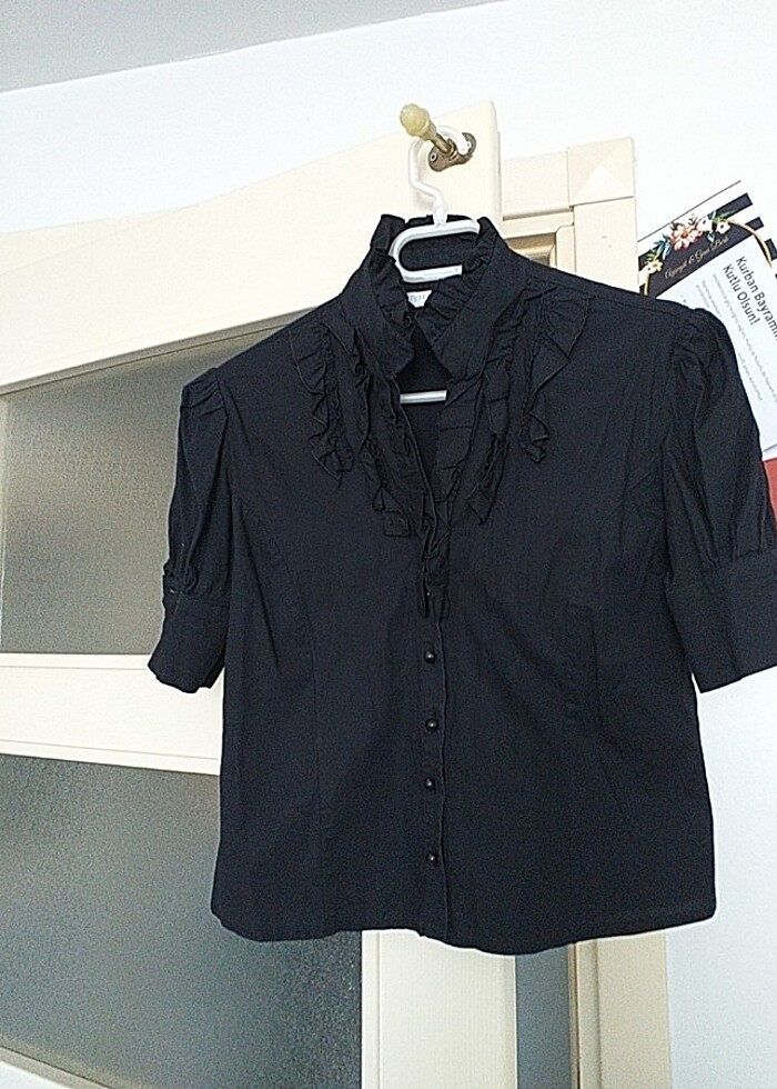 Hakim Yaka detayları fırfırlı Kısa kollu siyah renkli kumaş gomlek (38-40 bedenler için uygun olur dar kalıb olduğu için.