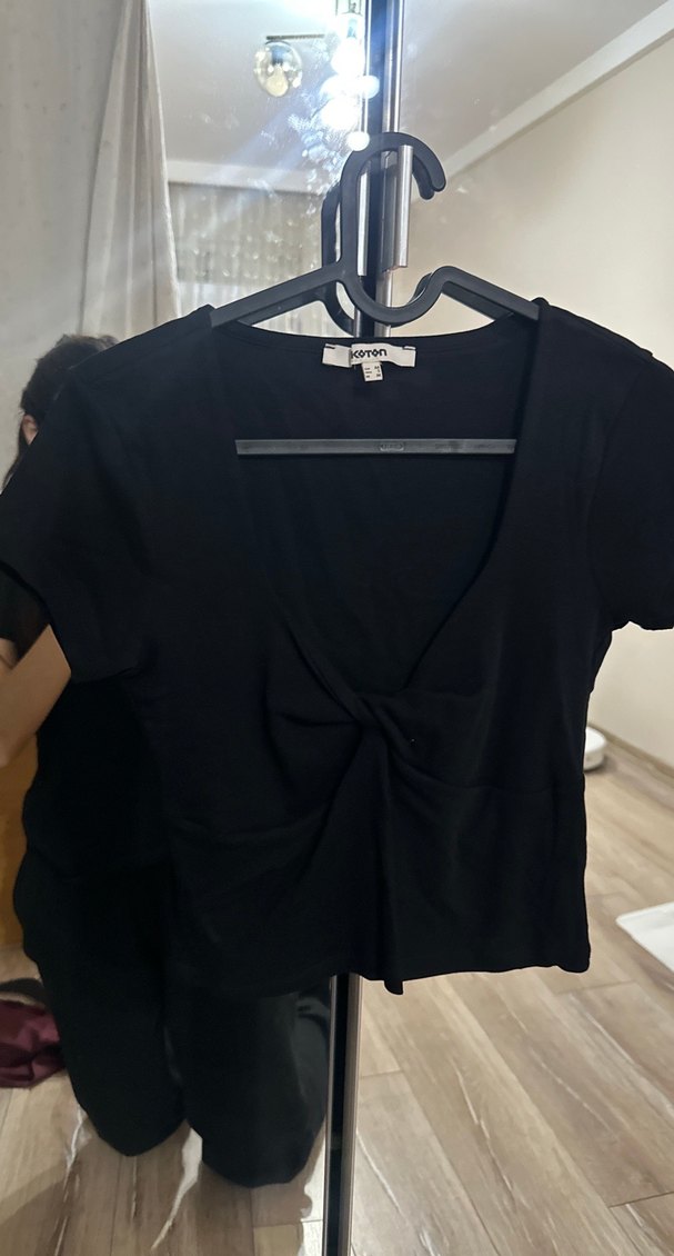 Kısa kollu, V yakalı ve tokalı detaylı, düz siyah, sentetik kumaştan yapılmış, günlük kullanım için uygun dar kesim bluz. Hiç dışarı giyilmedi, kombinleyemedim bir türlü.