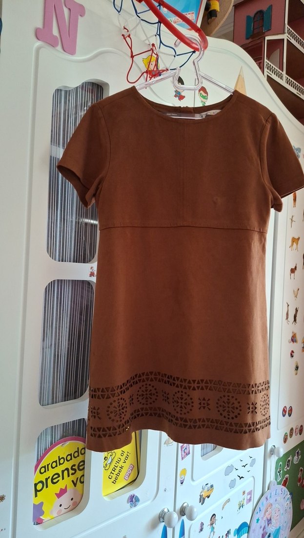Kısa kollu, yuvarlak yakalı kahverengi süet hamile tunik. Etek kısmında dantel detayları ve parlak yüzey bulunur, günlük kullanım için uygundur.
