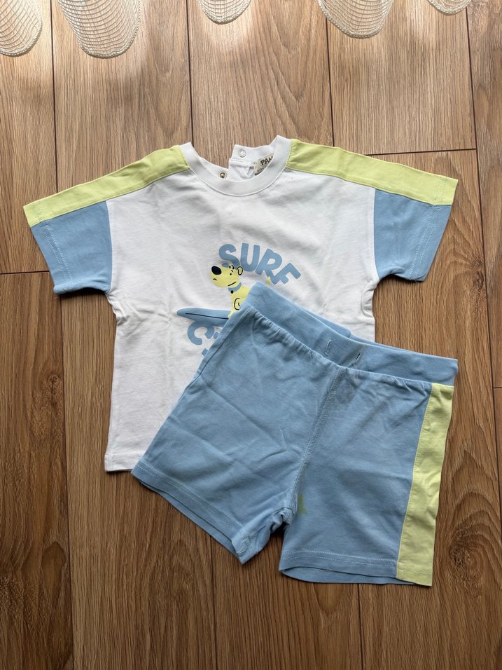 Panço kısa kollu şortlu takım, kumaşı çok hafif, pamuklu. 2 defa kullanıldı. Defo yok fakat Şortunda boya lekesi var çıkmıyor. 12-18 ay.