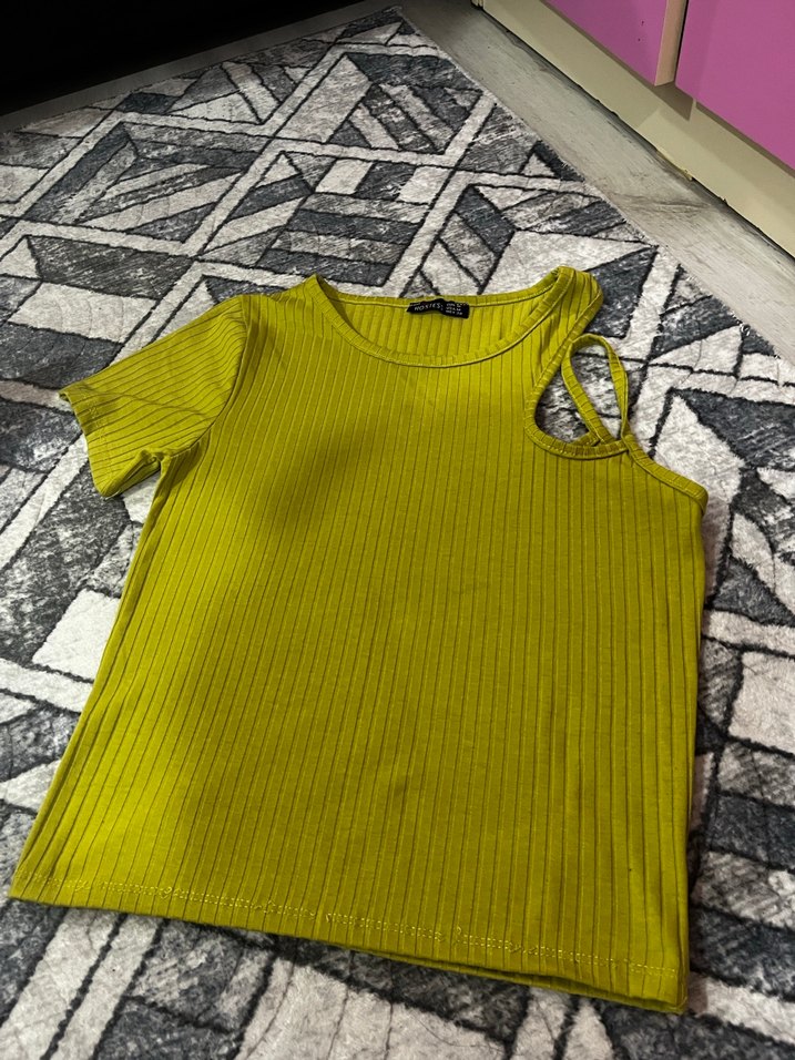 Sarı renkte, kısa kollu, triko dokulu, straplez bluz