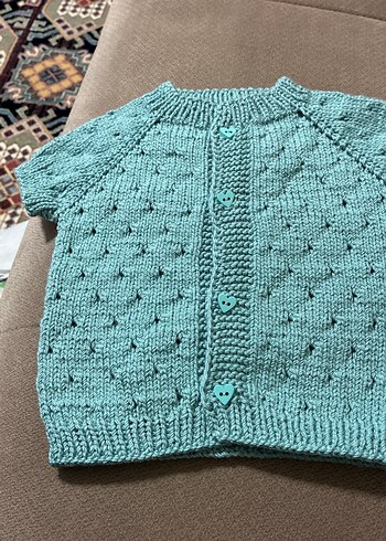Kısa kollu, turkuaz renkli, örgü dokulu ve vücuda oturan yelek. Rahat ve sade bir tarz sunar. yenidoğan