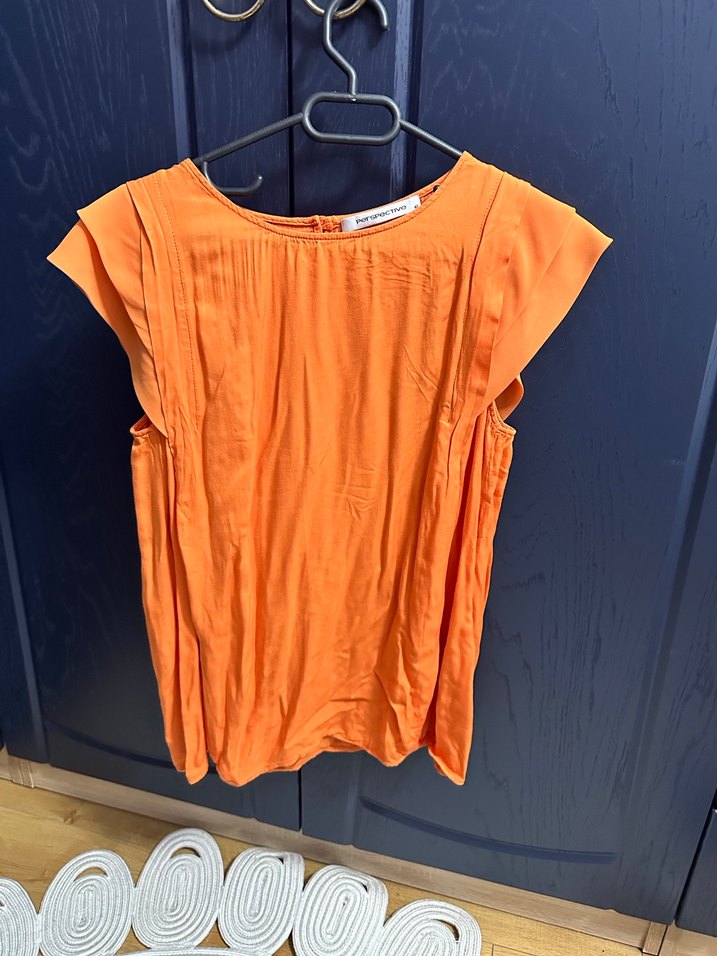 Turuncu keten bluz, kısa kollu, yuvarlak yaka ve pile detaylıdır. Salaş kesimiyle minimalist sokak stiline uygundur.