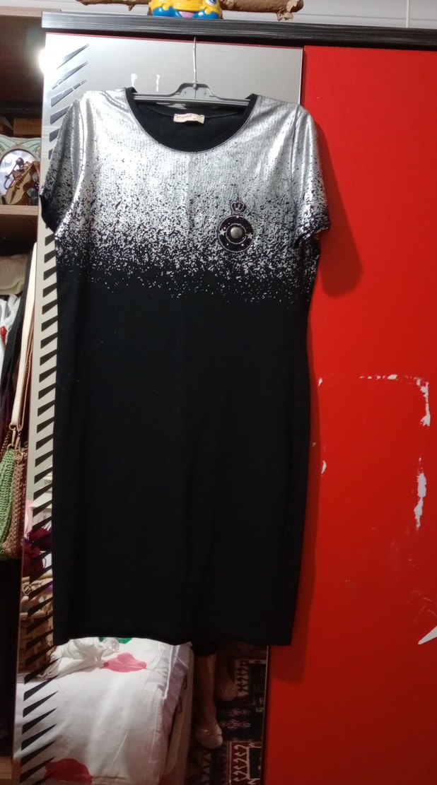Kısa kollu, bisiklet yakalı ve düğmeli detaylara sahip, gümüşten siyaha geçişli baskılı, siyah ve dar kesim gece elbisesi. Trend goth tarzına uygun.