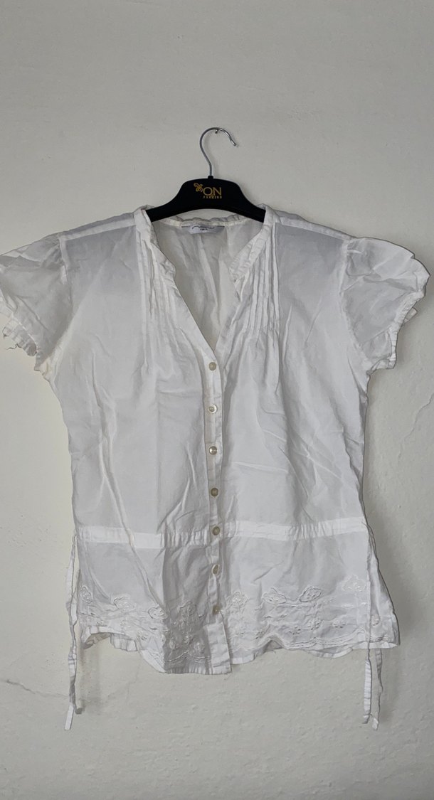 Düğmeli, kısa kollu, V yakalı beyaz keten gömlek. Alt kısmında hafif nakış detaylarıyla vintage bohem tarzını yansıtır.