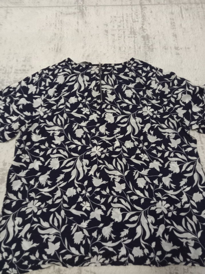 Koyu lacivert zemin üzerine beyaz çiçek desenli, kısa kollu, V yakalı, düğmeli, bol kesim kadın bluz.