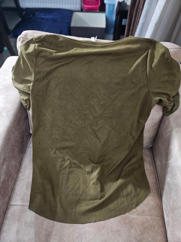 Yumuşak süet kumaştan yapılmış, kısa kollu ve V yakalı haki kadın bluzu. Drapeli tasarımı ve parlak dokusuyla günlük sokak stiline uygundur.