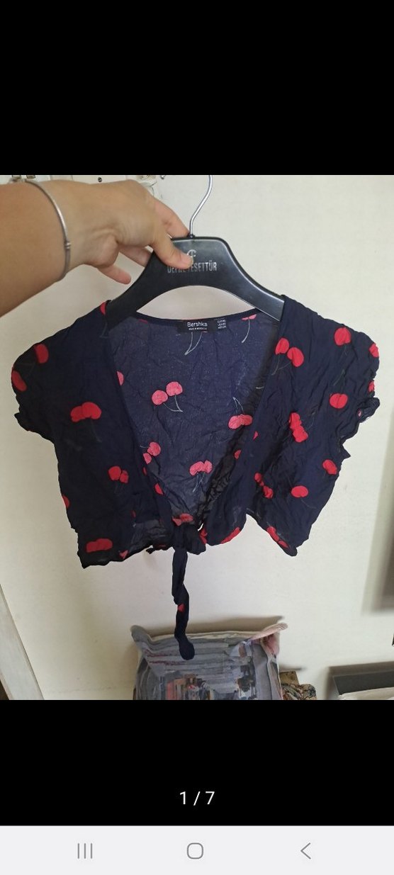 Düğmeli, kısa boy, V yaka ve kırmızı baskılı desenli, dar kesim bluz, tekstil malzemeden, günlük sokak stiline uygun.