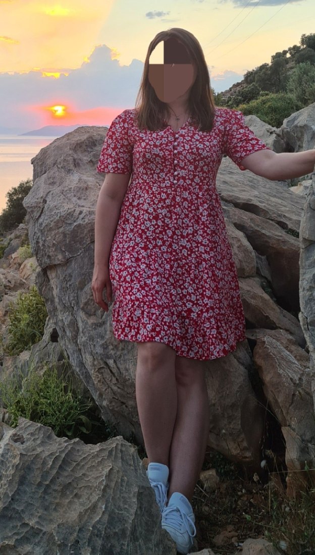 Kısa kollu, V yaka ve bol kesimli kırmızı midi elbise. Renkli çiçek desenli, volan detaylı ve bohem tarzda, günlük kullanıma uygun.