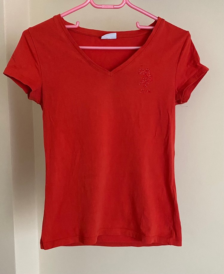 kırmızı renkte, V yakalı ve kısa kollu, rahat sentetik kumaştan yapılmış, vücuda oturan kadın tişörtü. ✨ görselde görüldüğü gibidir