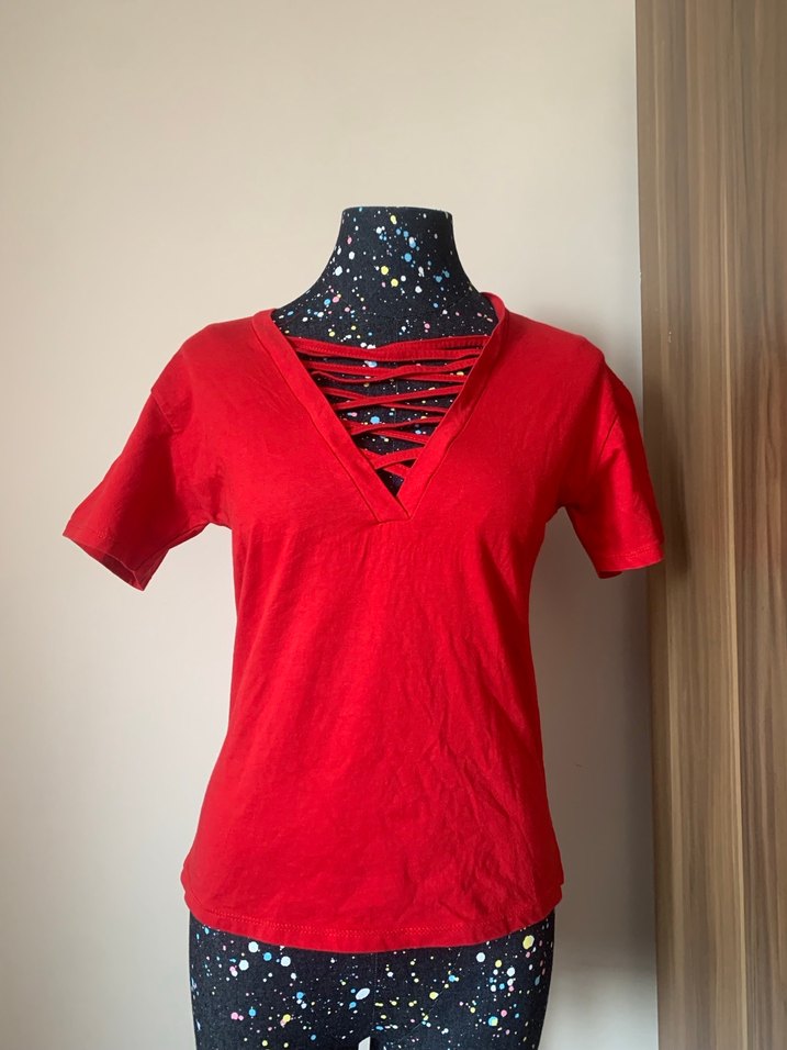 Kısa kollu, V yakalı yakası çapraz detaylı kırmızı tişört, renkli baskılı desenli ve bol kesim. Günlük kullanım için rahat ve şık bir sokak stili parçası. %100 pamuk, kullandığım manken S-M beden L bedende tamamen sarıyor bedeni