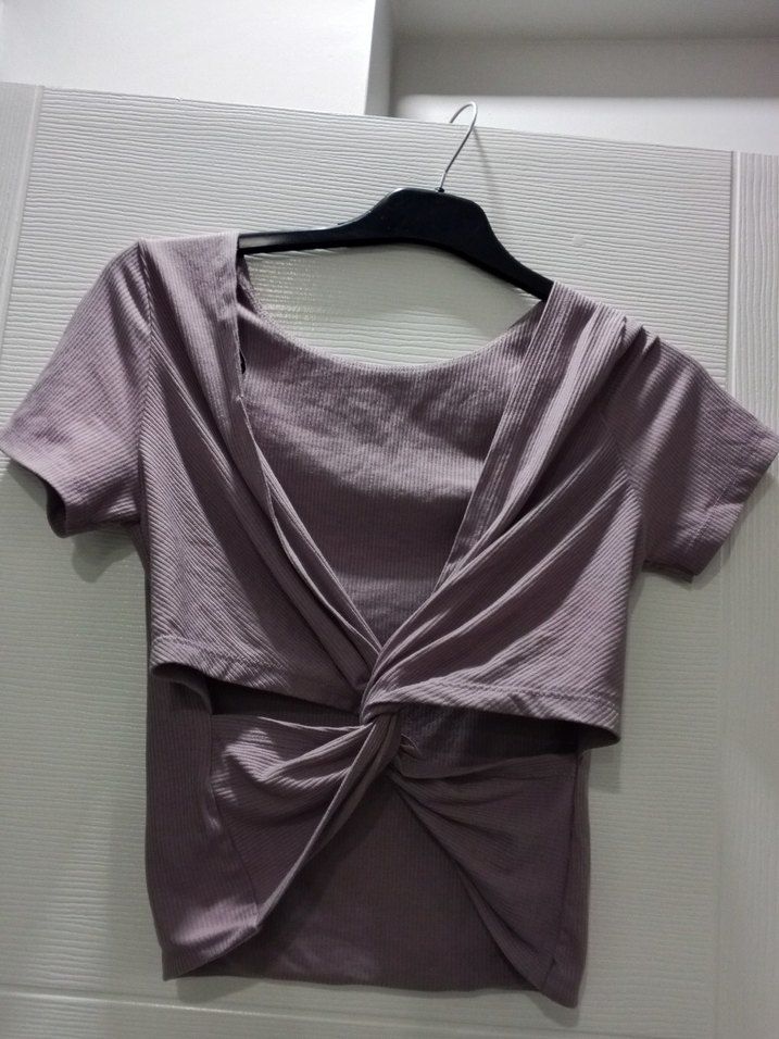 Mor kısa kollu, V yakalı ve pliseli detaylı crop top. Yumuşak sentetik kumaştan, vücuda oturan kesim. Günlük sokak stili için uygun.
