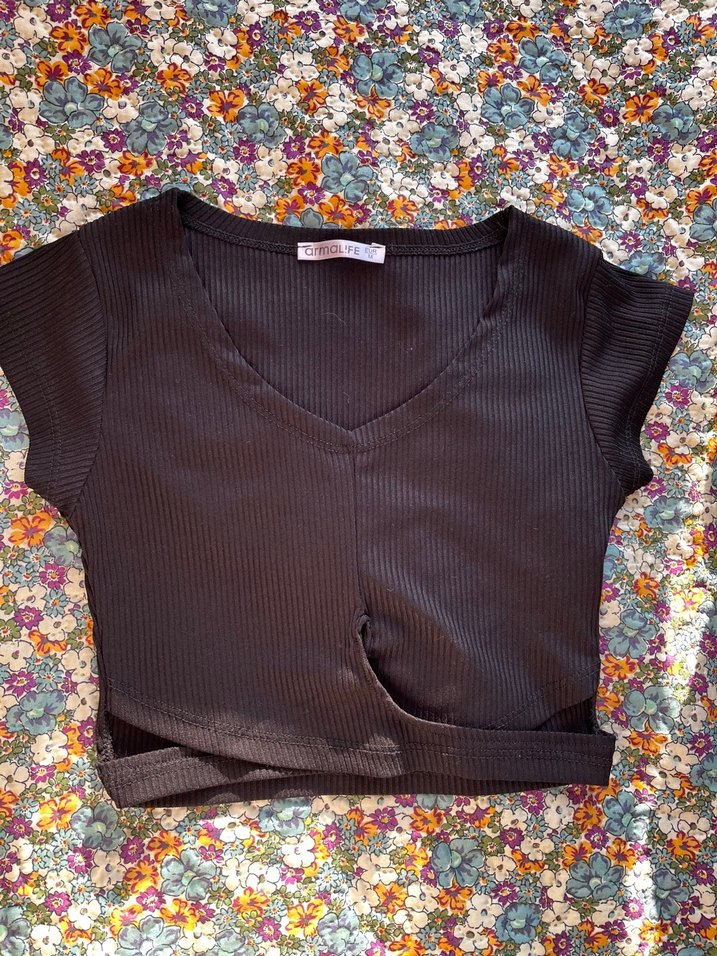 Kısa kollu, V yakalı ve kemerli siyah crop top, sokak tarzı için uygun ve günlük kullanıma ideal. M diyor ama kalıbı dar göğsünüz büyükse almanızı önermem crop olduğu için kısa gelebilir
