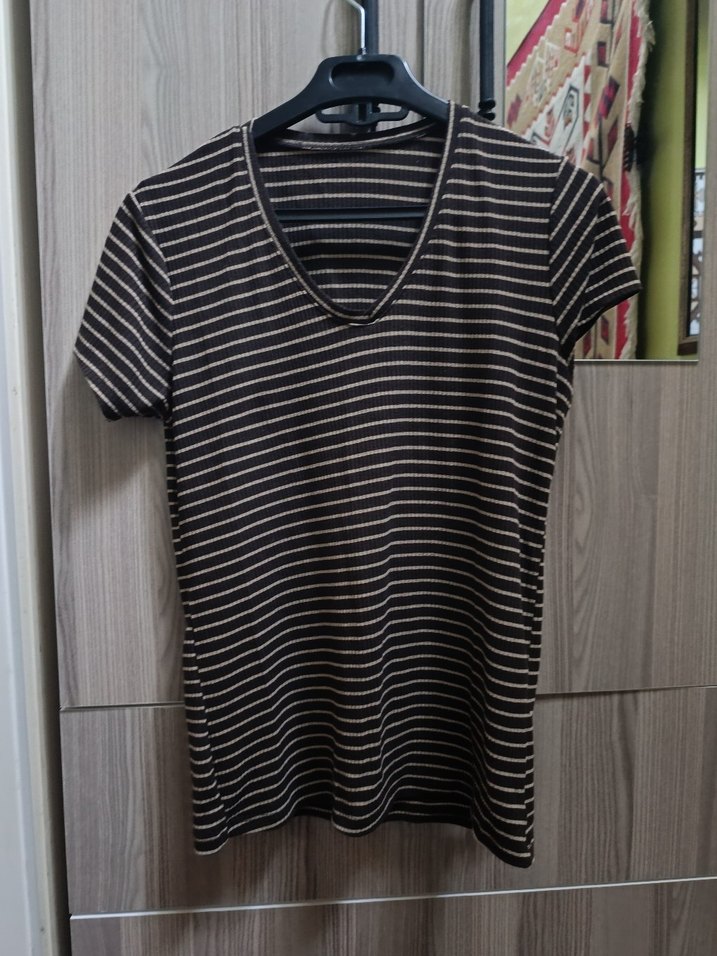 Kısa Kollu V Yakalı Çizgili Kadın Tişört