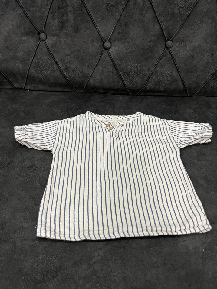 Nefes alabilen keten kumaştan, kısa kollu ve V yakalı erkek çocuk gömleği. Düğmeli detaylı, çizgili desende bohem tarzda.