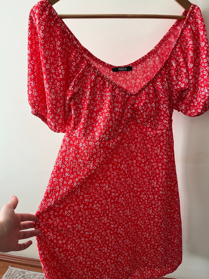 Kısa kollu, V yakalı ve drapeli kırmızı mini elbise, Esnek kumaşa sahiptir.