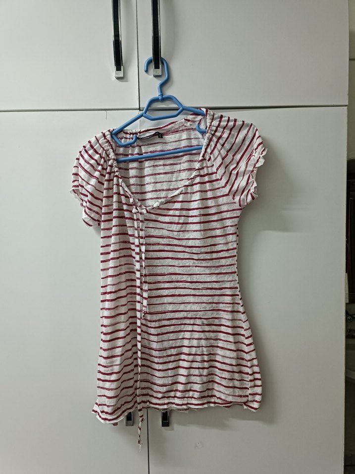 Kısa kollu, V yakalı ve pileli detaylı, yumuşak keten kumaştan yapılmış kırmızı ve gri çizgili hamile tişörtü. Günlük rahat stil için uygundur.