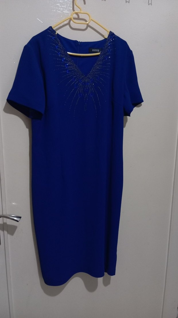 Kısa kollu, V yakalı, lacivert uzun elbise, drapeli ve parlak baskılı detaylara sahip, ofis kullanımı için uygundur, 1 defa kullanıldı, 44 beden uyumlu.