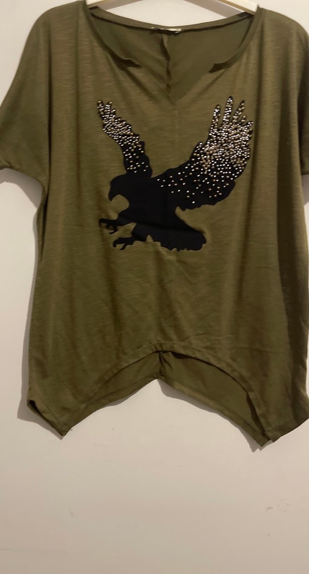 Koyu kahverengi, payetli kartal baskılı, kısa kollu, V yakalı, salaş kesim, kısa boy hamile tişörtü. Sentetik kumaştan, günlük ve sokak stiline uygun.
