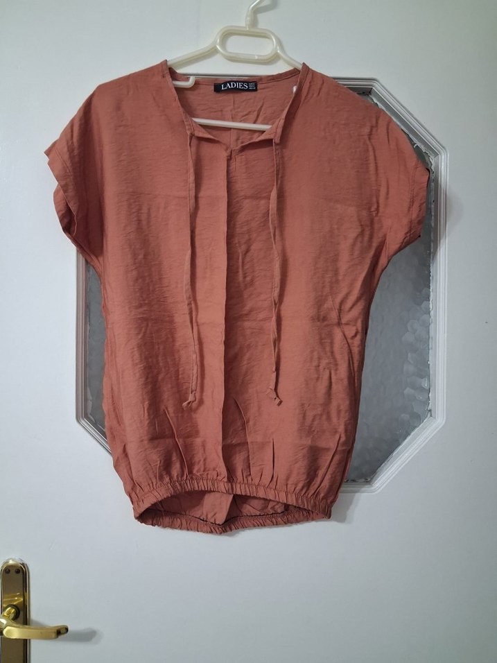 Keten kumaştan, kısa kollu, V yakalı ve kısa kesim salaş bluz. Düz ve rahat tasarımıyla günlük sokak stili için uygundur.