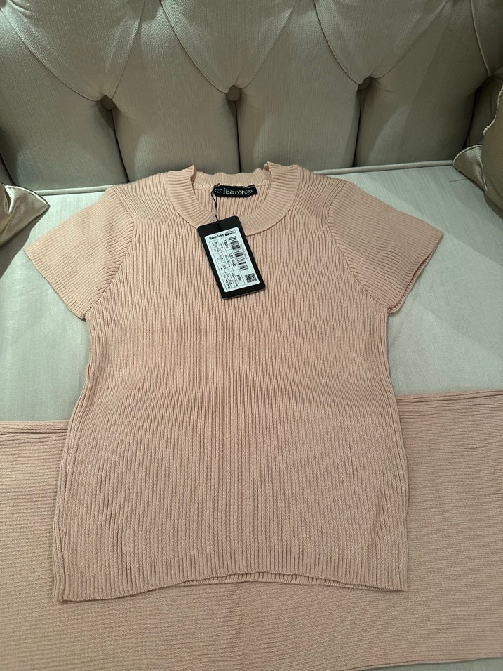 Kısa kollu, bisiklet yaka, bej renkli, vücuda oturan örgü triko takım Pantolon boy:97 bel:32 Kazak boy:47 Koltuk altı :35