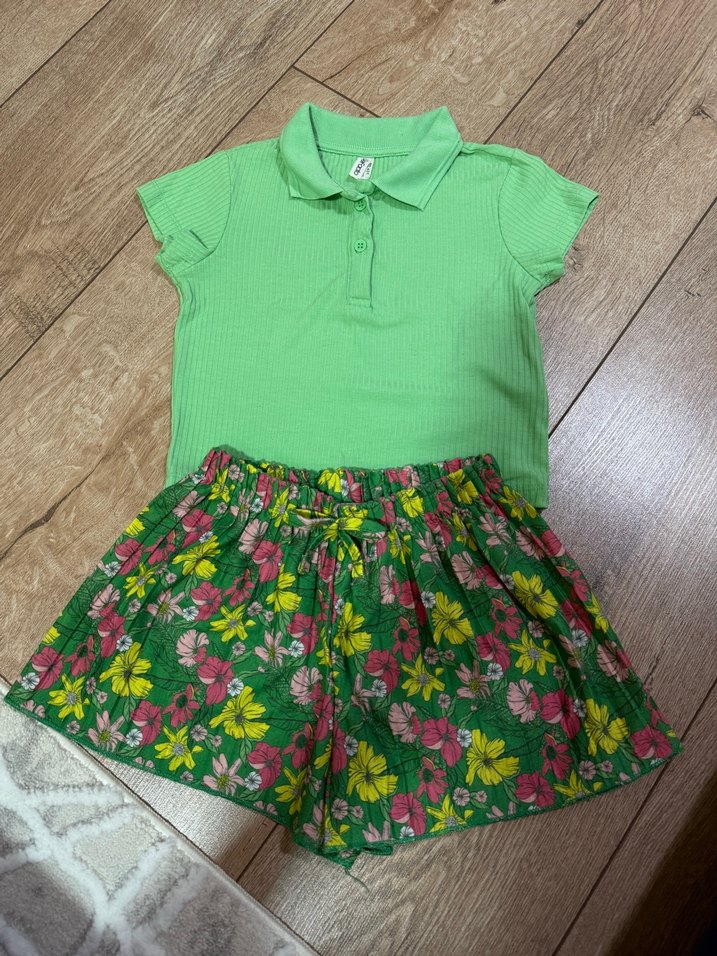Kısa kollu yeşil polo üst ve renkli, pilili çiçek desenli şortlardan oluşan bebek kız takımı.