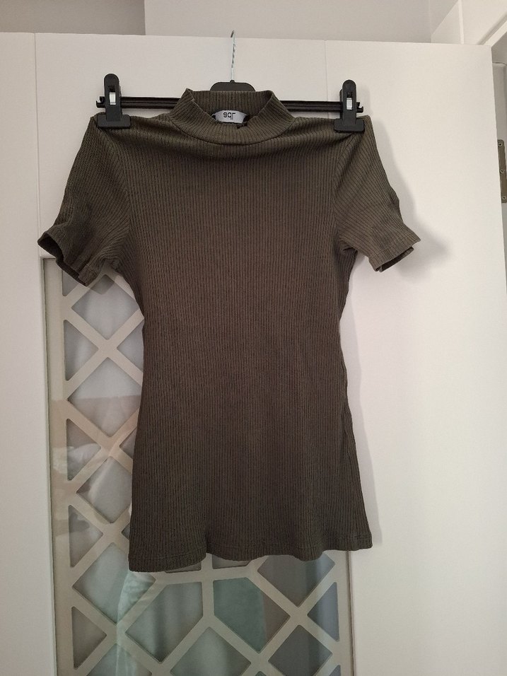 Kahverengi, kısa kollu, yüksek yakalı ve vücuda oturan bu kadın tişörtü, yumuşak sentetik kumaştan üretilmiştir. Günlük rahat ve şık sokak stili için uygundur.