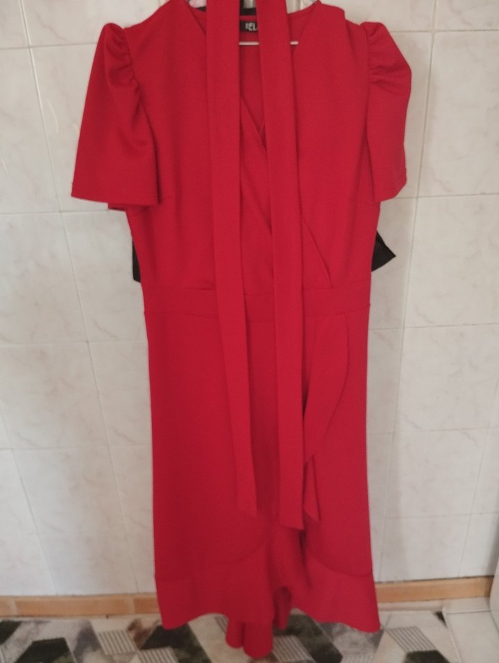 Kısa kollu, yüksek yakalı ve drapeli detaylara sahip kırmızı, parlak ve yumuşak dokulu uzun elbisedir. Sokak modasına uygundur.