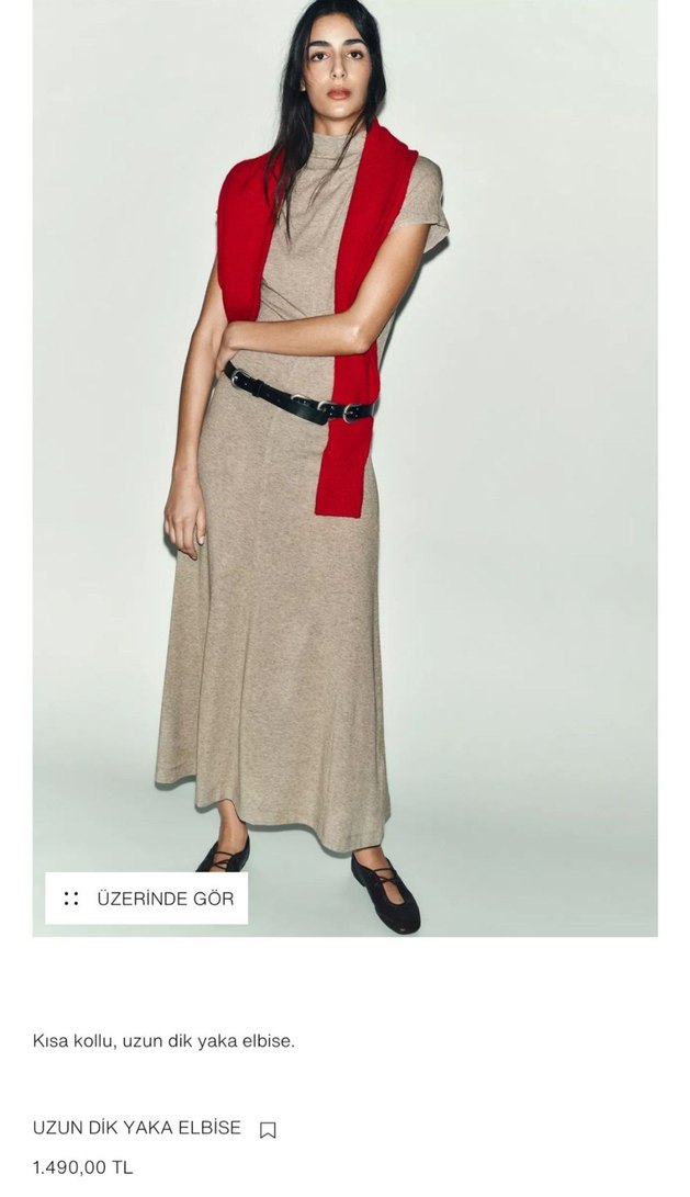 Kısa kollu, uzun dik yakalı, bel kemerli yün elbise. Rahat ve bol kesim, camel renginde günlük kullanıma uygundur.