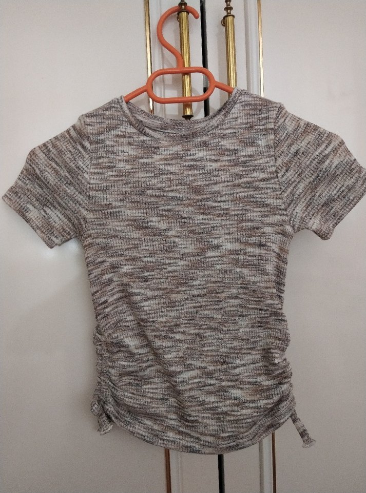Kısa kollu, yuvarlak yakalı, kahverengi batik desenli kadın triko tişört. Yanlarda büzgülü ve kısa kesimdir, günlük sokak stiline uygundur.
