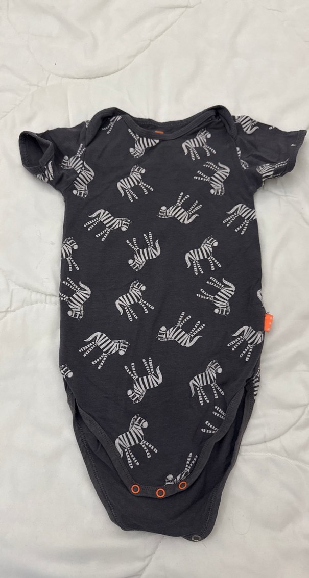 Koyu gri renkli, kısa kollu ve yuvarlak yakalı bebek body. Zebra desenli ve çıtçıtlı kapamalı, yumuşak ve sıcak kumaştan yapılmıştır.