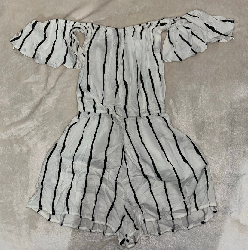 Keten kumaştan yapılmış, zebra desenli, fırfırlı ve kayık yakalı kısa kollu, vücuda oturan kısa tulum. Bohem ve Paris tarzı, dış mekan kullanımı için uygundur.