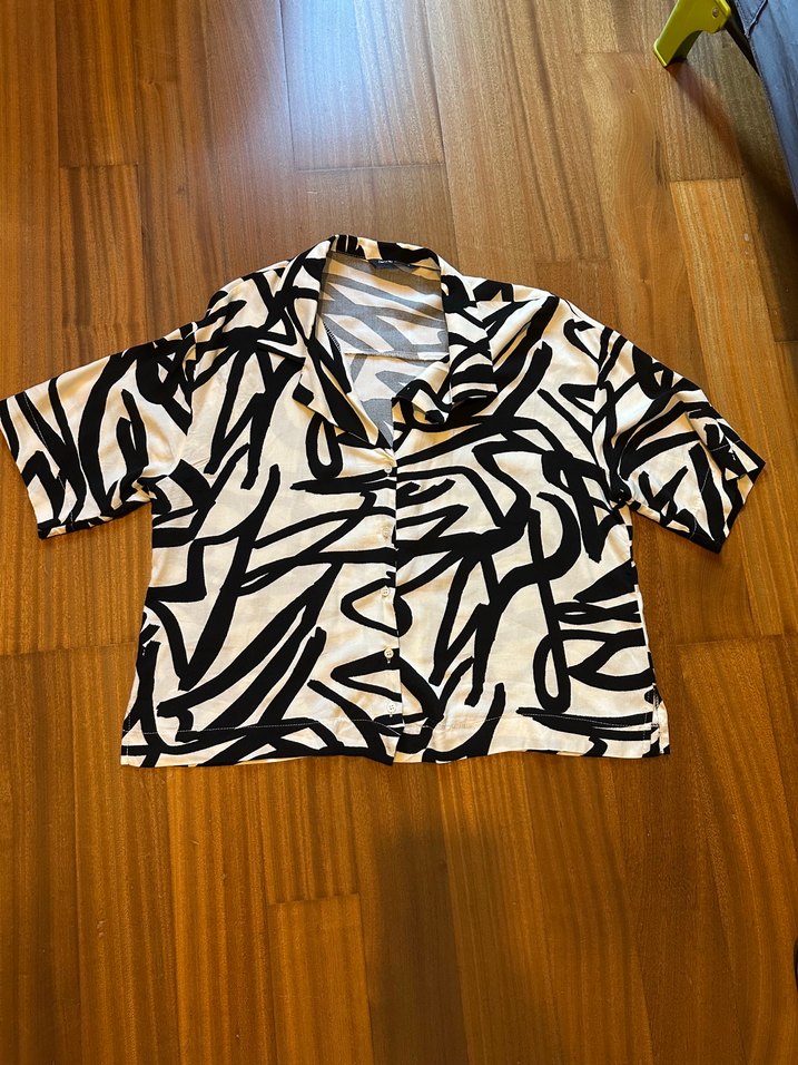 Kahverengi sentetik kumaş üzerinde siyah-beyaz zebra desenli, kısa kollu, düğmeli, bol kesim mini kadın gömleği. Boyun kısmı tekne yakadır.