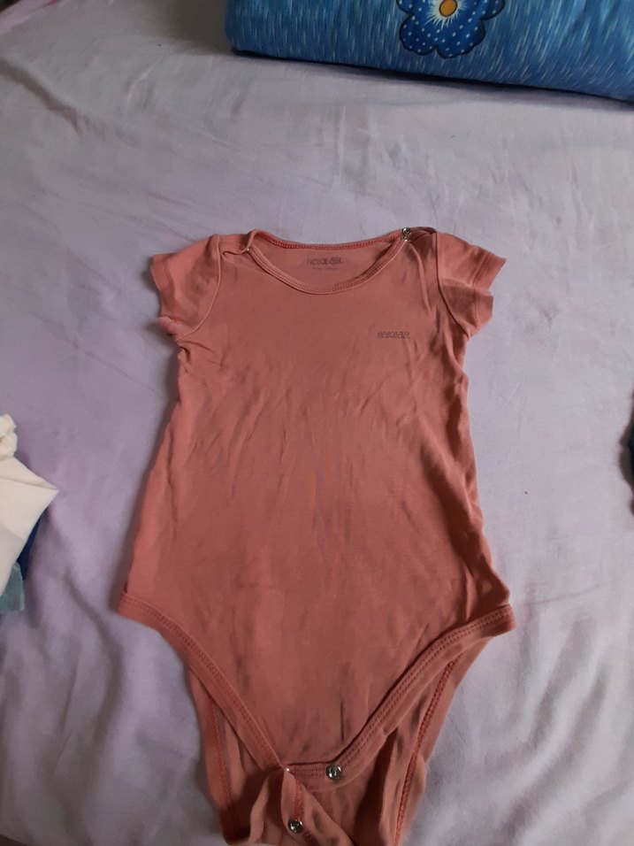 Pastel pembe renkte, kısa kollu ve yuvarlak yakalı bebek body, sade ve şık bir görünüm sunar.