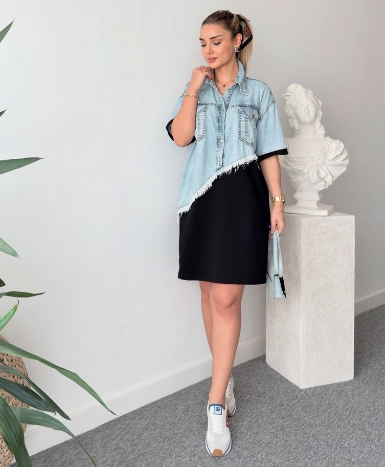 Bol kesim, kısa boy, kayış yakalı ve kısa kollu kot kumaştan yapılmış elbise. Açık renk kot ve siyah batik desenli,günlük sokak stili için uygundur.