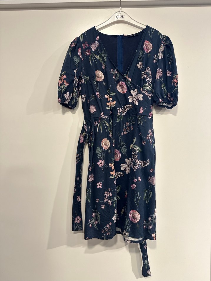 Lacivert mini elbise, çiçek desenli, V yakalı ve bol kesim. Kısa askılı kollu olup, belden kemer detaylıdır, bohem ofis stili için uygundur.