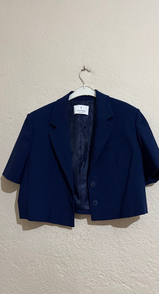 Lacivert kadın blazer ceket, kısa kollu, kesik yaka ve düğmeli kolları drapeli 1 kez giyildi