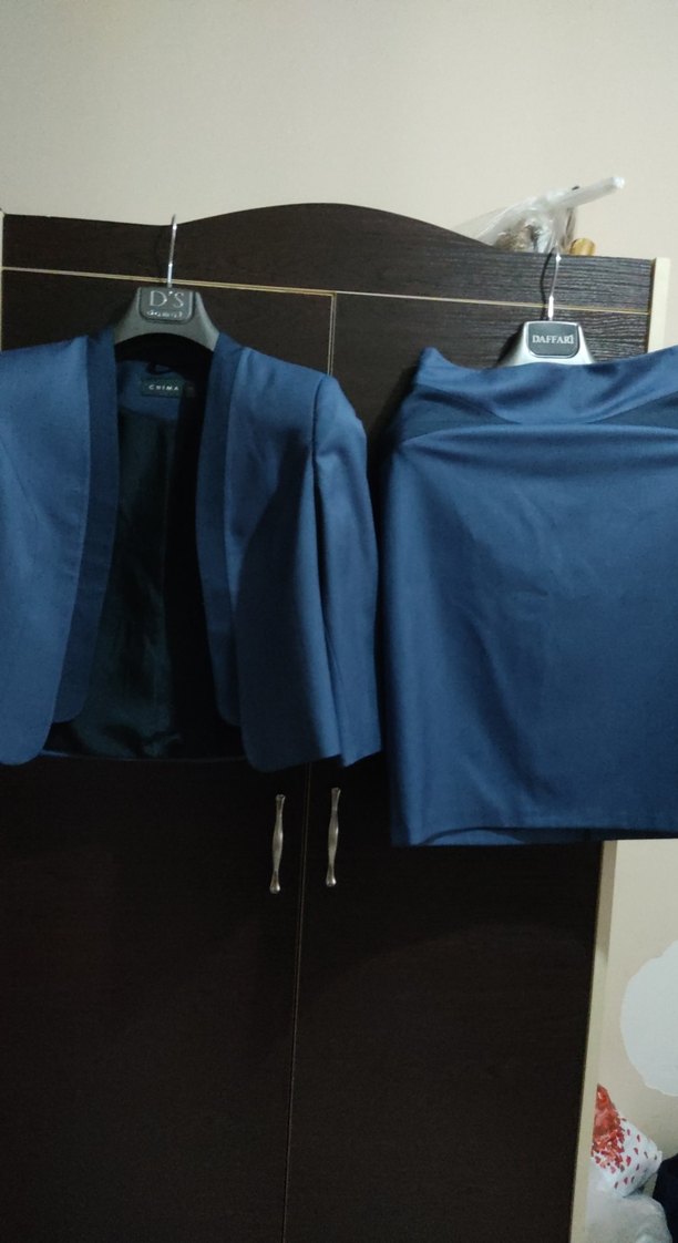 Kadınlar için kısa, yakalı ve drapeli blazer ile uyumlu lacivert mini etekten oluşan takım elbise. Uzun kollu, regular fit ve sentetik kumaştan üretilmiştir.