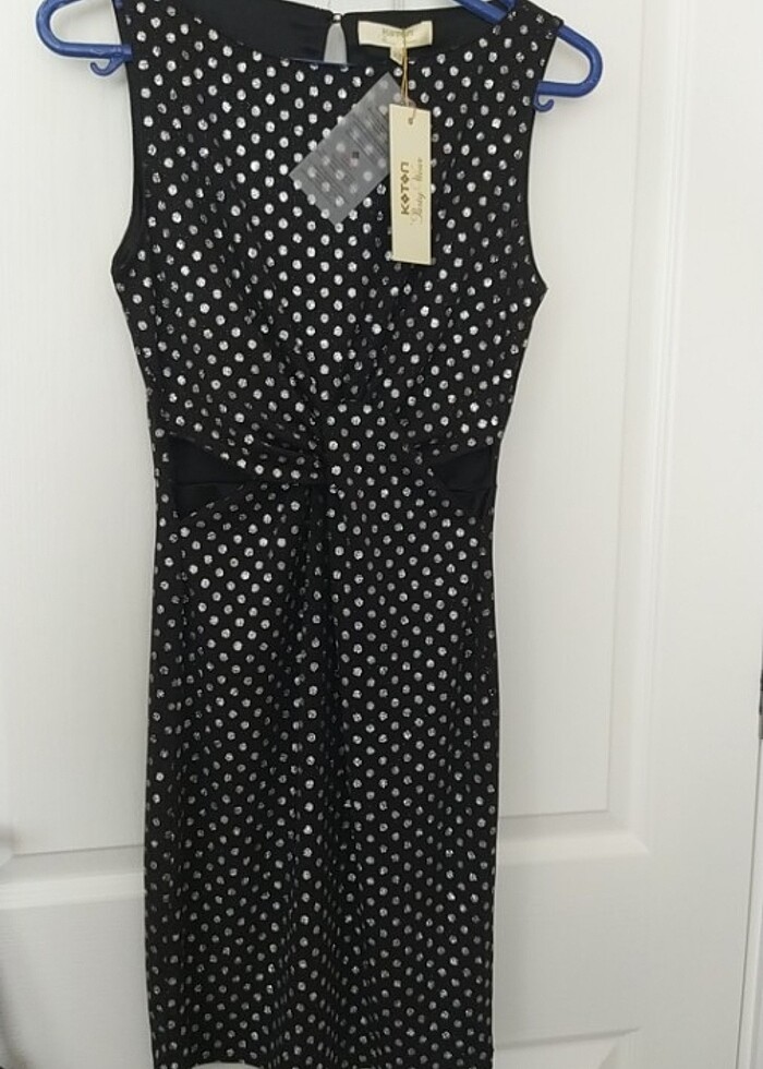 Sadece 1 saat giydim .Diz üstü simli puantiyeli bel kısmında yanlarda dekoltesi var vücudu sarıyor. Astarlı. Hiçbir kusuru yok. Bedeni XS ama S bedene de olur (Son fiyat)