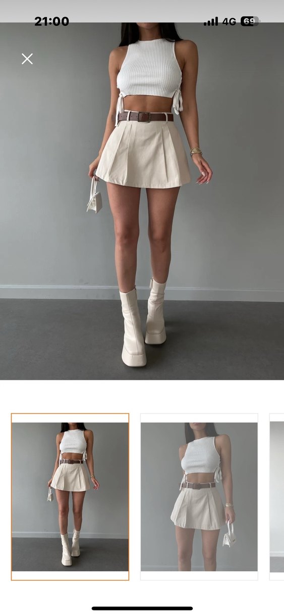 Beyaz, deri kumaştan yapılmış kısa ve dar kesim mini etek, günlük sokak tarzına uygun zahmetsiz şıklık sunar.