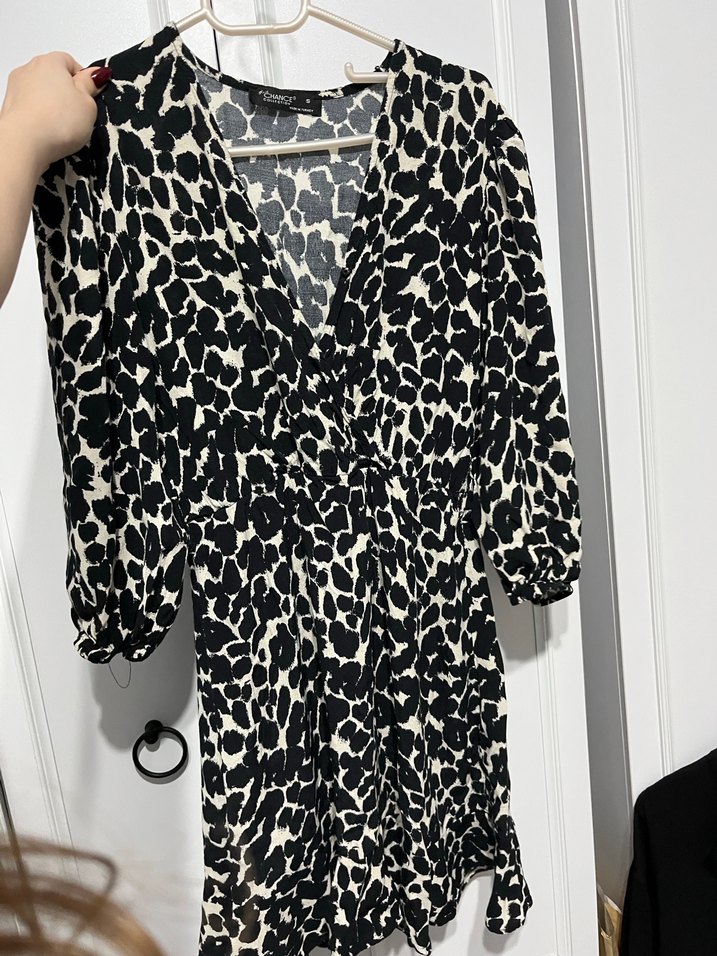 Bu kısa, vücuda oturan mini elbise siyah yılan desenli, uzun kollu ve kürk detaylıdır. V yakalı, trend sokak giyimi tarzındadır.