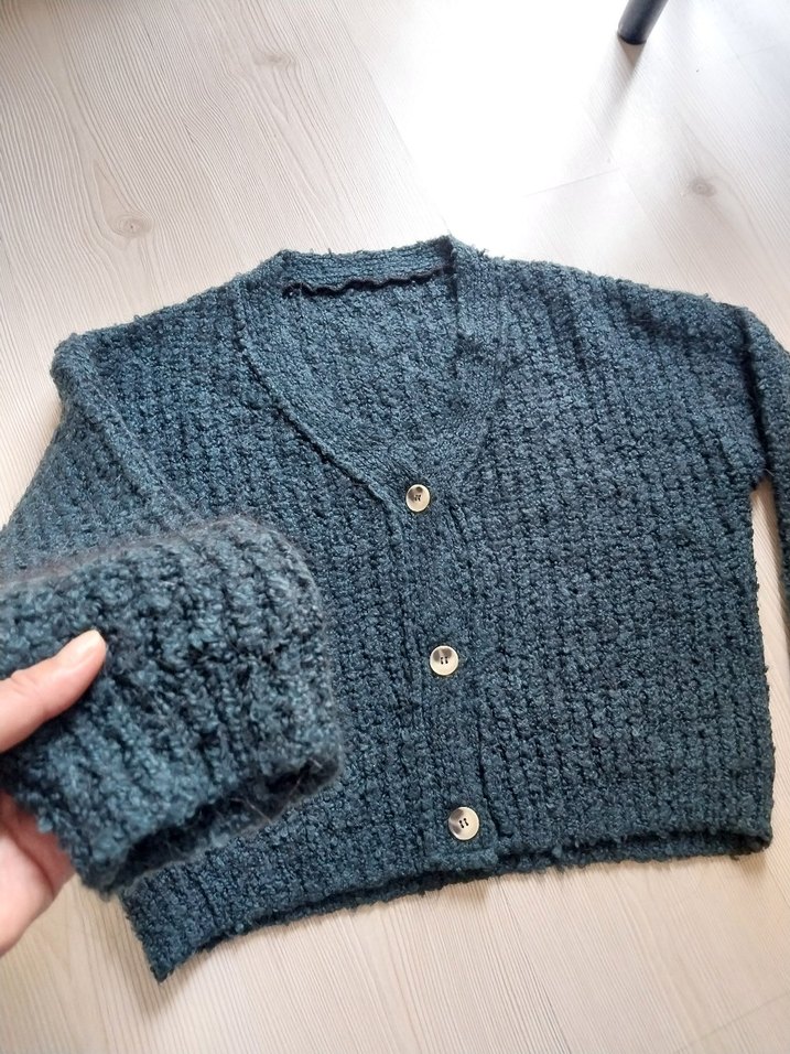 kısa ve bol kesim örgü kadın hırka. Uzun kollu, düğmeli ve sade tasarımlıdır, günlük kullanım için uygundur.