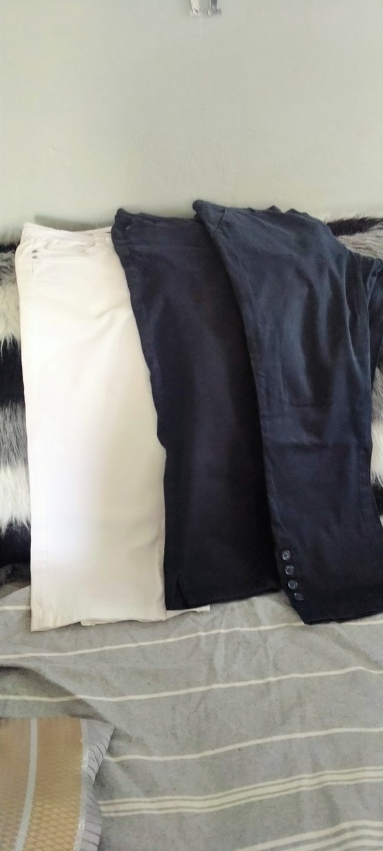 Düğmeli, normal boy midi kadın kumaş pantolonlar, , beyaz ve koyu renk seçenekleriyle. Normcore Paris tarzında, günlük kullanıma uygun. Üçünün fiyatı