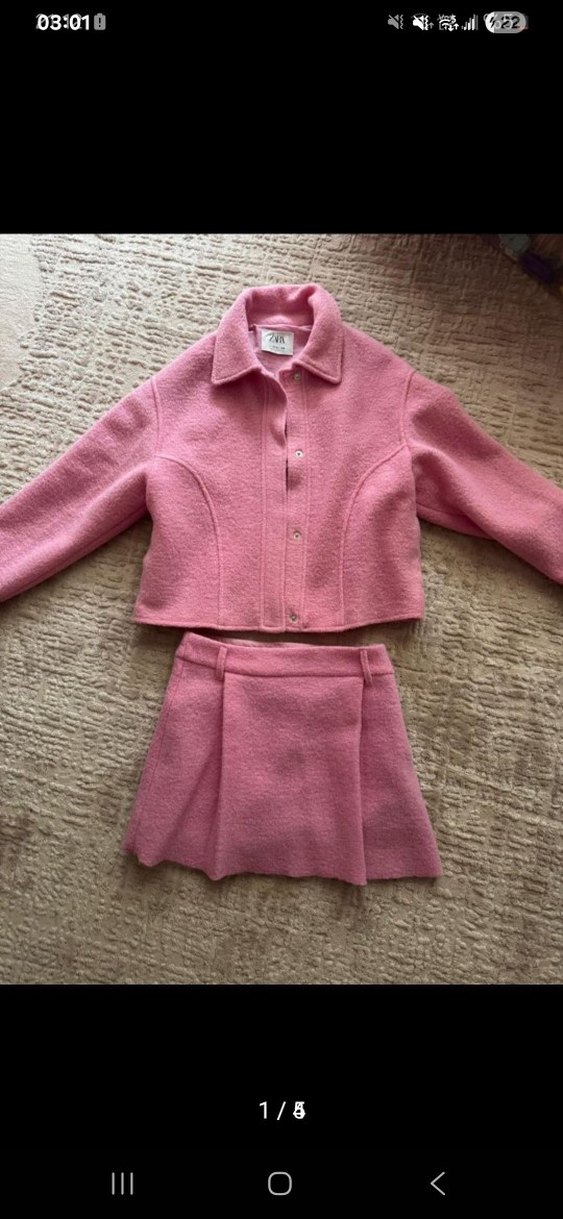 Kısa, pastel pembe renkli, düğmeli ceket ve mini etekten oluşan kiz cocuk takımı. Yumuşak ve rahat kumaştan, uzun kollu ve kesik yaka ile tasarlanmıştır. Regular fit ve desensiz.