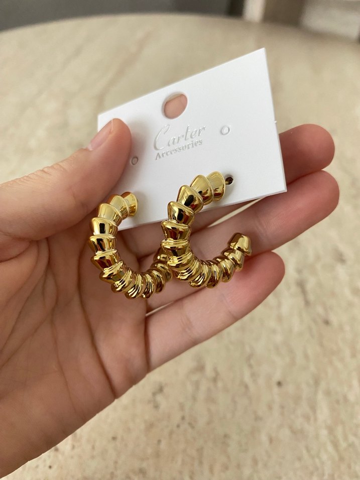 Parlak altın renkli, kısa uzunlukta pilili ve yılan deseni detaylı küpeler. Minimalist, çağdaş tarzda, klasik şıklık için uygun. Marka: Ourio.