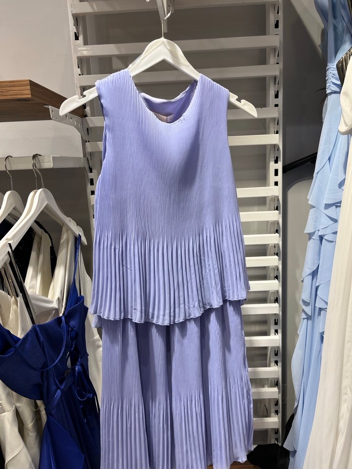 Pastel mor renkte, kolsuz ve kısa piliseli tasarıma sahip, bol kesim elbise. Sentetik kumaştan yapılmış, yuvarlak yakalı, trend günlük stil için uygun.